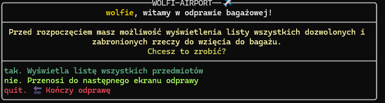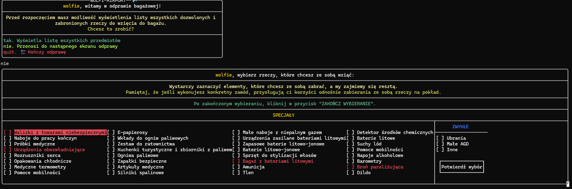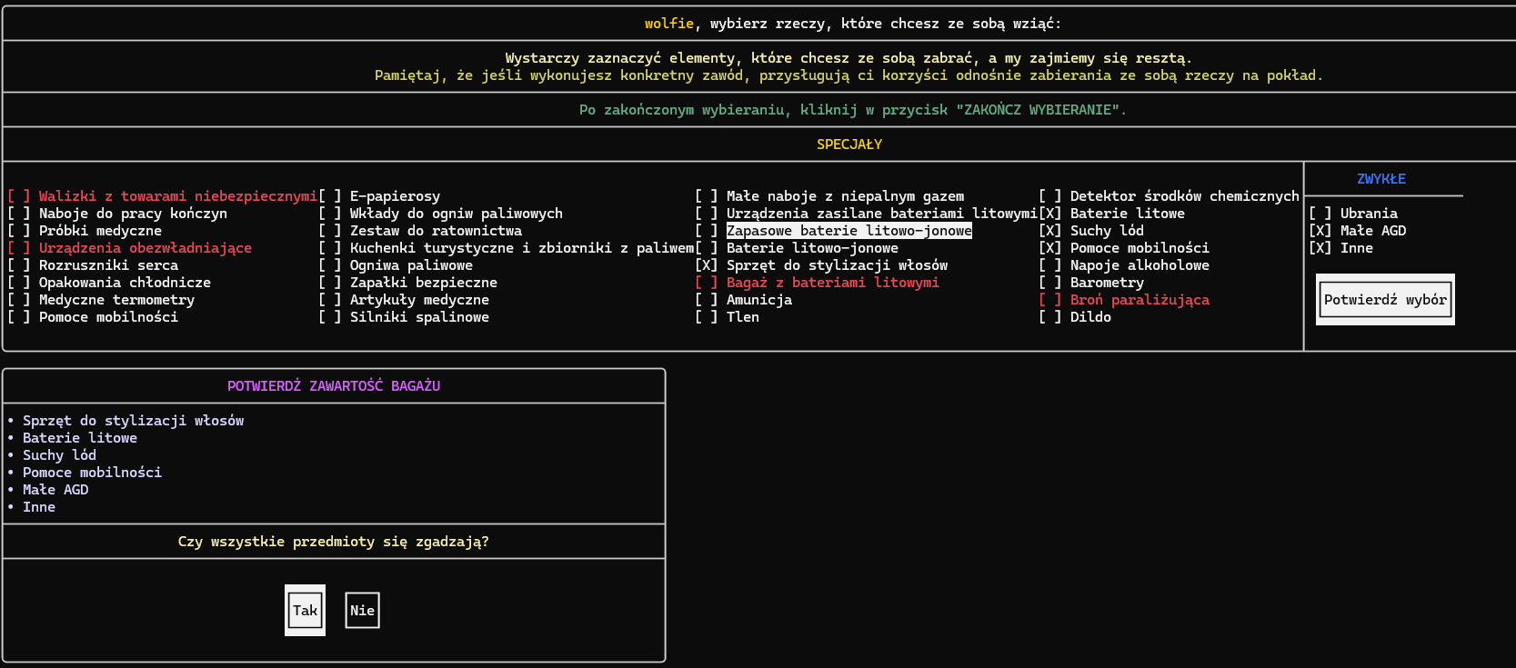 Tutaj należy zaznaczyć wszystkie rzeczy, które użytkownik chce ze sobą wziąć. Jak widać, niektóre przedmioty pojawiły się na czerwono. Są to przedmioty zabronione.