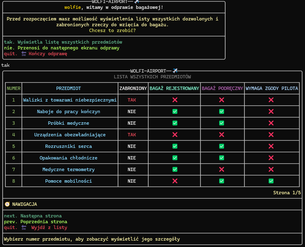 Ktoś może zadać sobie pytanie: Czemu w odprawie bagażowej w ogóle uwzględniać przedmioty zabronione? Odpowiedź jest bardzo prosta. Mianowicie, te przedmioty nie są zabronione dla każdego, przykładowo, Broń paraliżująca jest dostępna i niezabroniona dla osoby, która wykonuje zawód policjanta. Oczywiście, dla tej osoby, takowy przedmiot nie wyświetla się na czerwono. Dla zwykłego użytkownika jest to jedynie informacja wizualna, a podczas wyboru tego przedmiotu bez uprawnień, odprawa zakończy się niepowodzeniem.