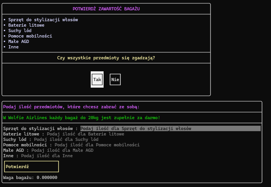 Po potwierdzeniu zgodności zawartości bagażu, wyświetla się następny ekran odprawy, proszący o wprowadzenie ilości przedmiotów, które chcemy zabrać.