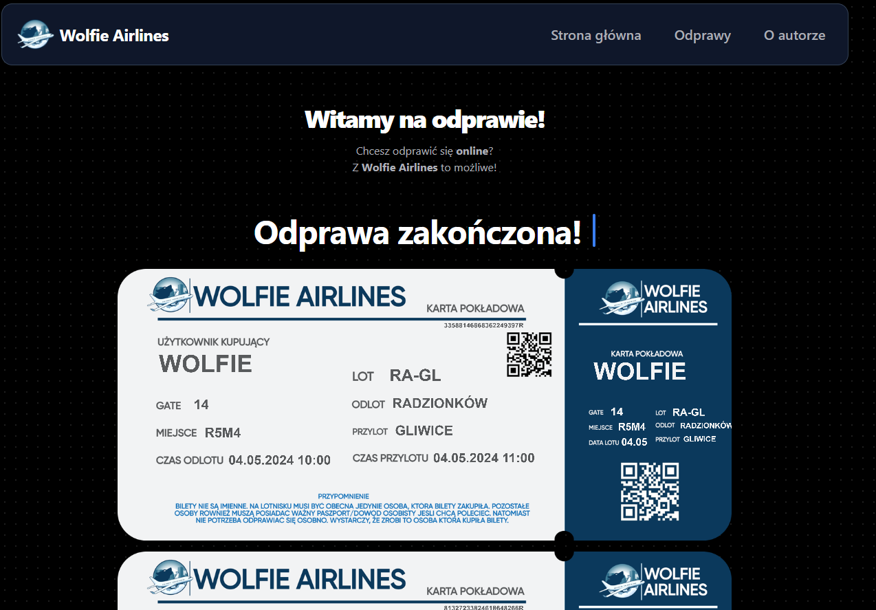 Wolfie Airlines to projekt lotniska oraz linii lotniczych powstały na potrzeby projektu zaliczeniowego na studia. Od samego początku programowania tego projektu poczułem z nim specjalną więź. Chciałem stworzyć coś niesamowicie unikalnego. Mam nadzieję, że podołałem i sprostałem swoim oczekiwaniom.