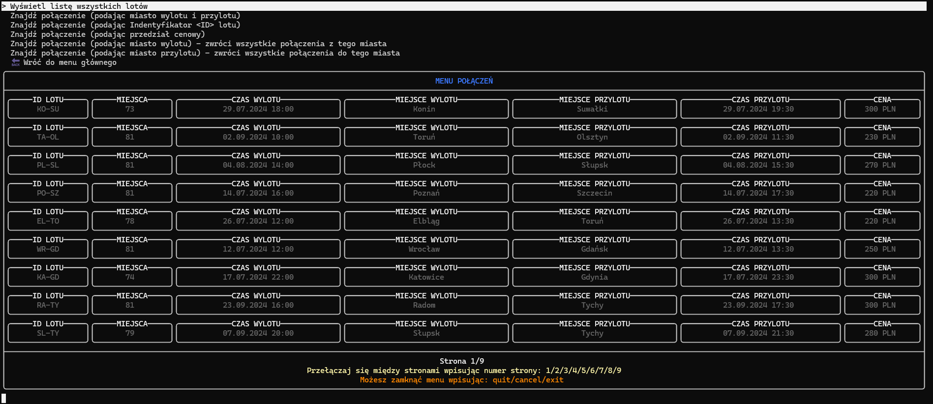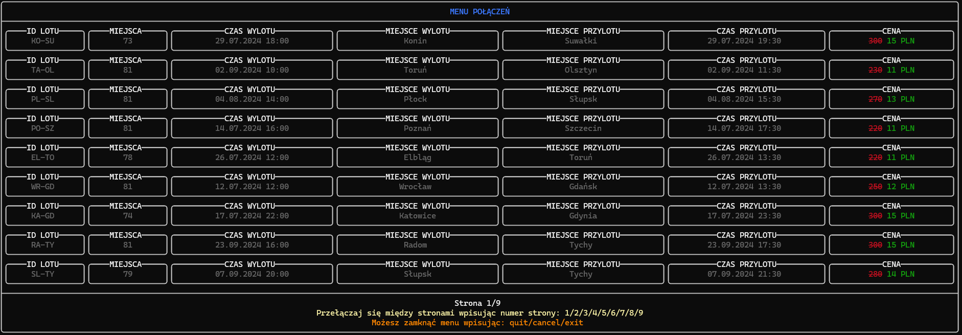 Wyświetlił nam się cały ekran z możliwością paginacji (zmiany stron) pomiędzy wyświetlonymi lotami.