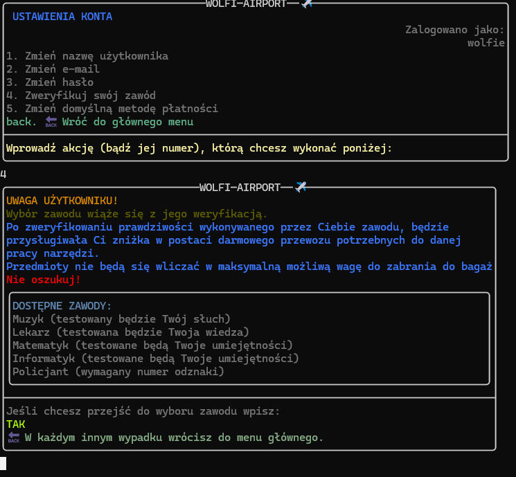 LOTY- dodawanie nowych lotówPYTANIA WERYFIKACYJNE- dodawanie nowych pytań weryfikacyjnych (do weryfikacji zawodów)ZARZĄDZANIE UŻYTKOWNIKAMI- zmiana nazwy użytkownika, e-mailu, wydanych pieniędzy, daty założenia konta, liczby zakupionych biletów, itd.DODAWANIE NOWYCH PRZEDMIOTÓW- nowe przedmioty do tabeli przedmiotów w odprawie bagażowej