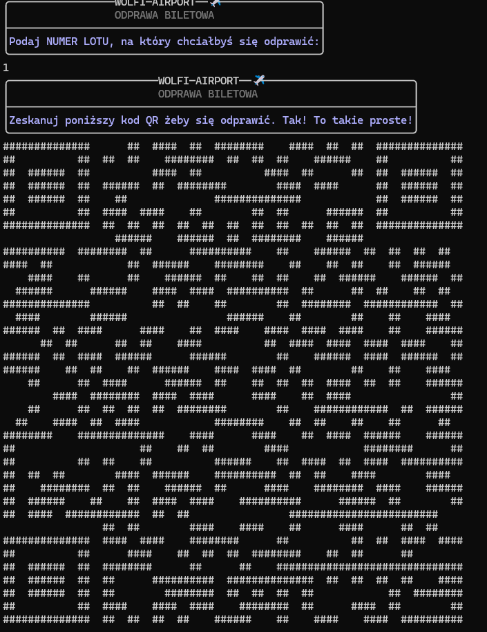System odpraw w Wolfie Airlines jest mocno nastawiony przyszłościowo, szybko i skutecznie. Albowiem wystarczy jedynie zeskanować kod QR żeby przeprowadzić całą odprawę. Nie trzeba nic wpisywać, nic podawać, ani tym bardziej - dodatkowo dopłacać.