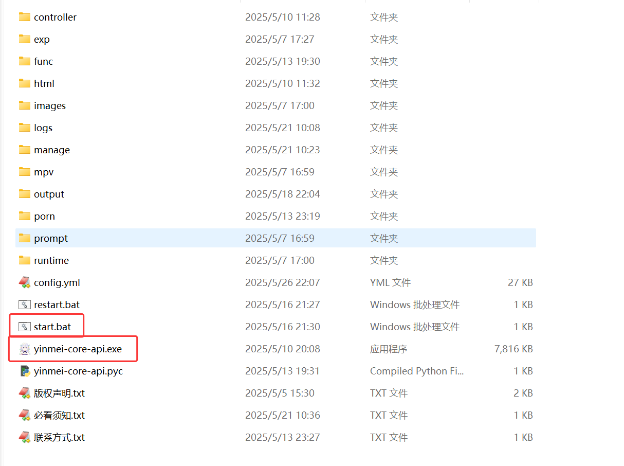 双击启动“start.bat"或者"yinmei-core-api.exe"