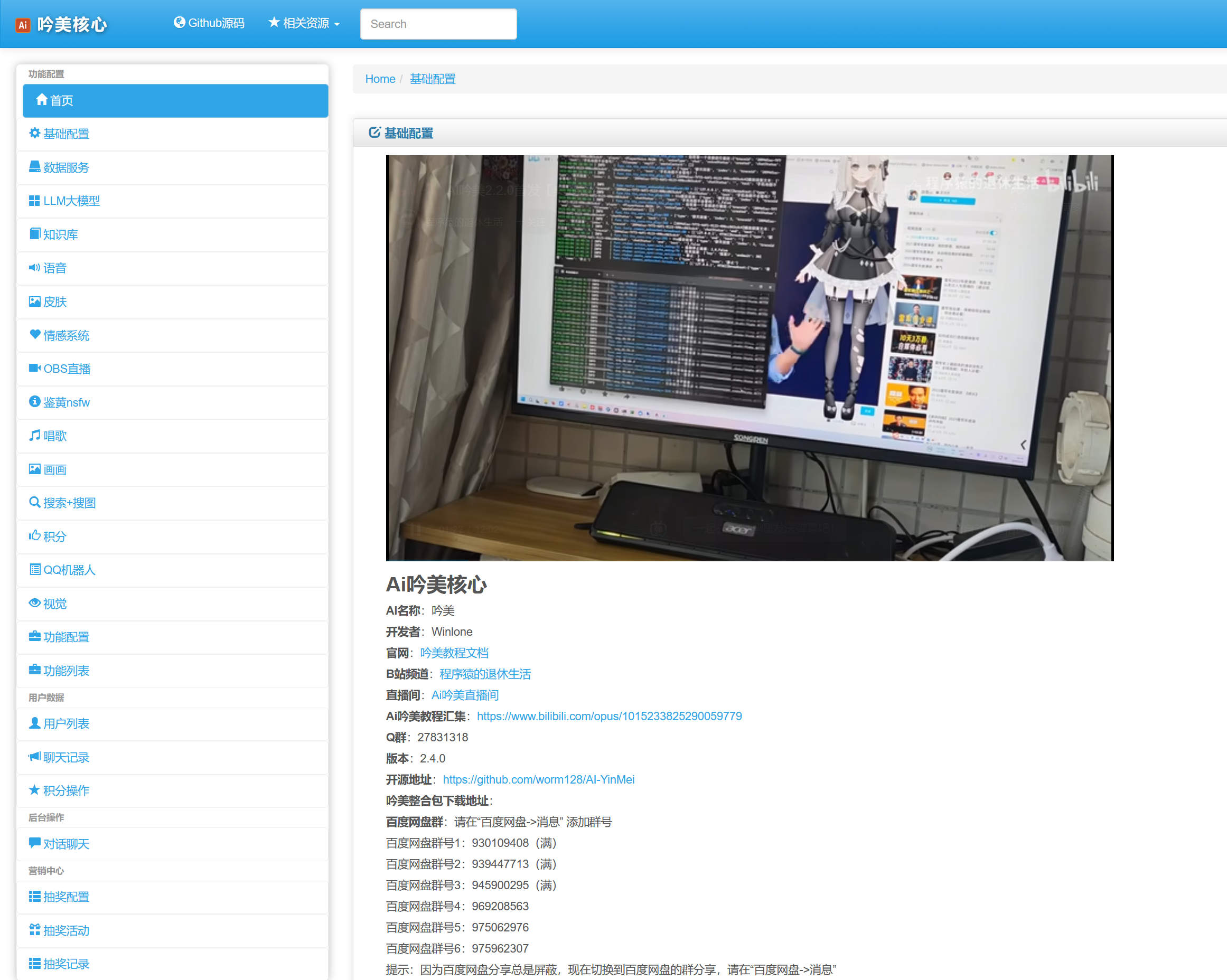 - 弹幕: 吟美核心、B站、qq机器人:napcat