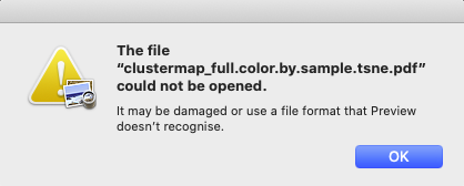 Whilst I can open the circos plot, hcluster and heatmap, none of the .tsne.pdf files will open. They are all listed as 4 kb in size and when I try to open them, I get the following error message: