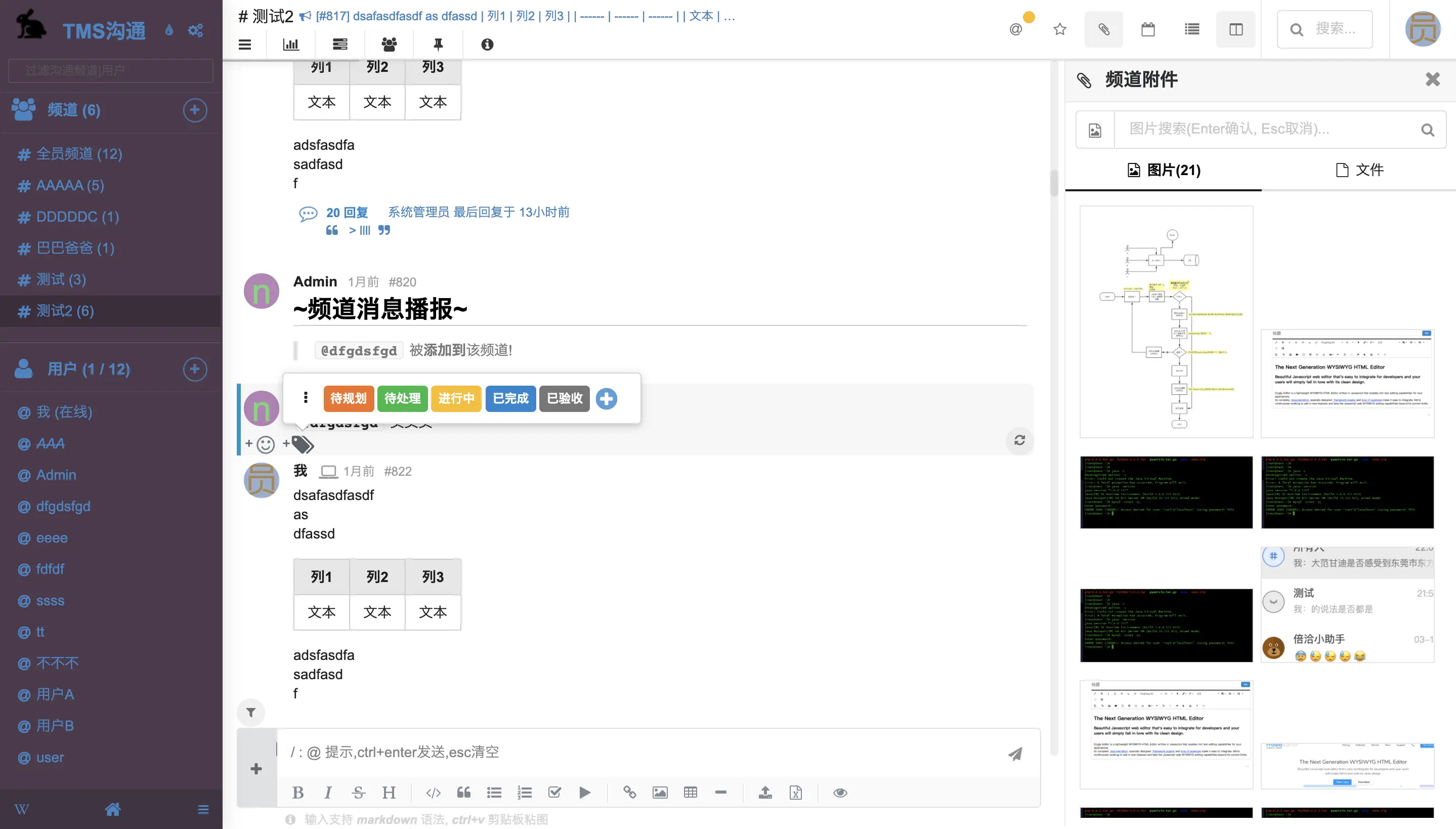 TMS是基于频道模式的团队沟通协作+轻量级任务看板,支持mardown、富文本、在线表格和思维导图的团队博文wiki,i18n国际化翻译管理的响应式web开源团队协作系统。