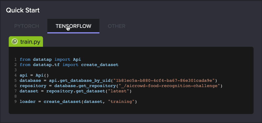 The dataTap Python library is the primary interface for using dataTap's rich data management tools. Create datasets, stream annotations, and analyze model performance all with one library.