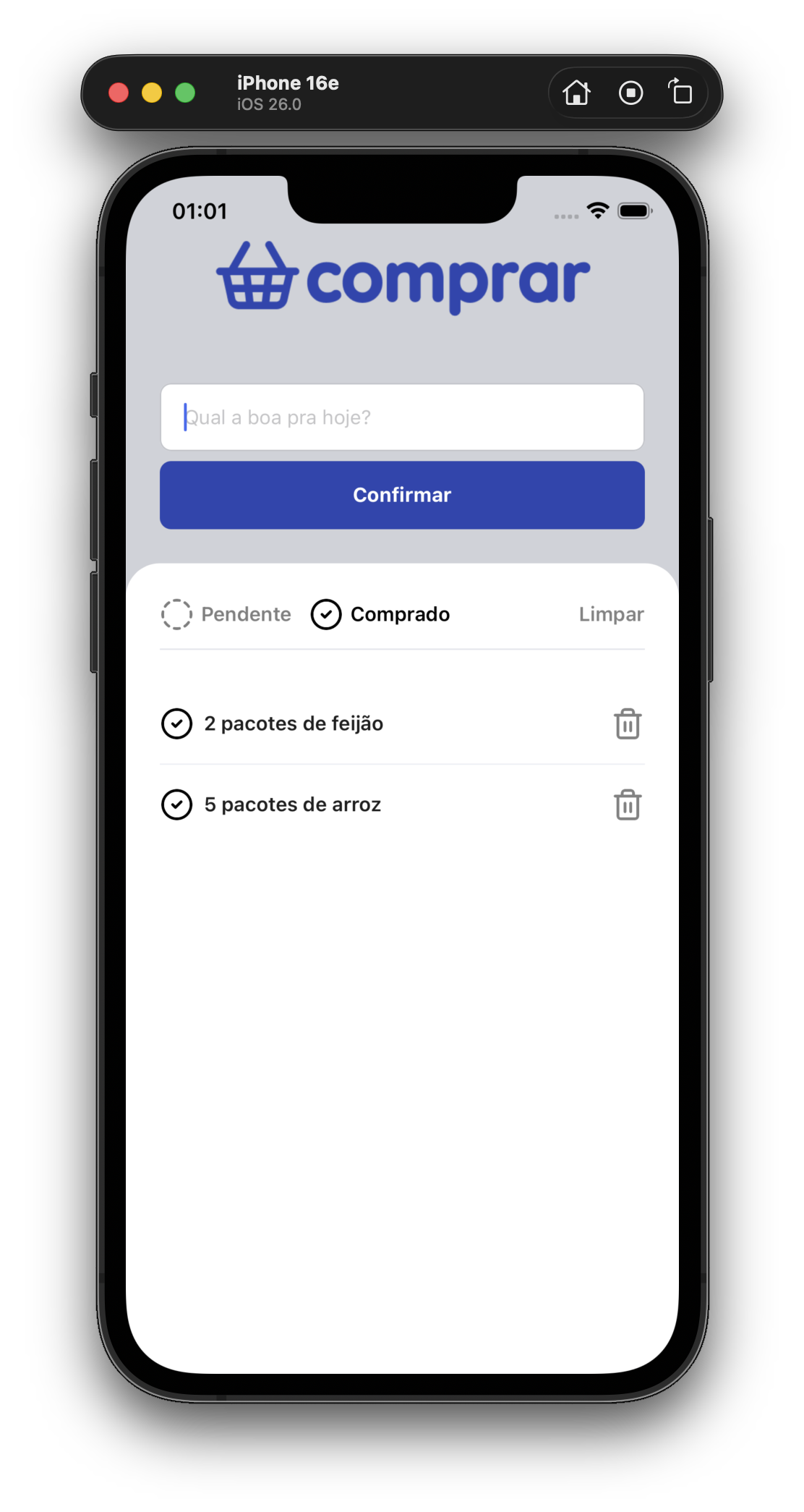 ComprarApp is a "to buy" todo list app I built during Rocketseat's React Native 2025 course as part of the Fundamentals Module. It's basically a simple shopping list where you can add items you need to buy and check them off as you go - perfect for practicing React Native basics with something useful!